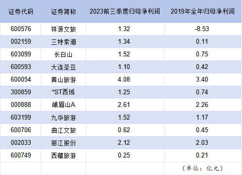 值得一提的是,已有多家公司2023年前三季度的業績超過2019年全年(如下圖)。其中,祥源文旅、九華旅游、長白山、大連圣亞和*ST西域5家公司,2023年前三季度的營收超過2019年全年;黃山旅游、麗江股份、峨眉山、九華旅游、長白山、三特索道、祥源文旅、*ST西域、大連圣亞、西藏旅游、曲江文旅等11家公司,2023年前三季度的歸母凈利潤已經超過了2019年全年。