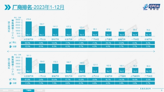 在乘聯(lián)會2023年乘用車零售銷量排名里,前十家有五家是中國汽車品牌,分別是比亞迪、吉利、長安、奇瑞等;中國汽車品牌年度份額達到了52%。尤其比亞迪和奇瑞、吉利銷量增速更為明顯。比亞迪新能源汽車銷量達到302萬輛,同比增長61.9%,超越特斯拉成為全球新能源汽車銷冠。