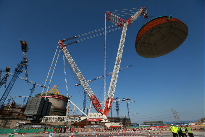 目前,華龍一號首批4臺機組全部建成投運,批量化建設進展順利。在首批建成投運的華龍一號機組建設過程中,中聯重科多類設備參與建設助力該項超級工程。例如,在華龍一號全球示范工程包括福清核電5、6號兩臺機組,都由中聯重科超大噸位履帶吊ZCC3200NP承擔這兩座核島穹頂吊裝。