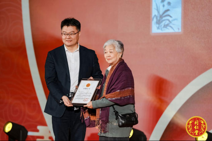 同仁堂“雙龍標”商標設計者莊書英作品捐贈儀式,同仁堂集團副總經理邸淑兵向莊書英頒發捐贈證書。