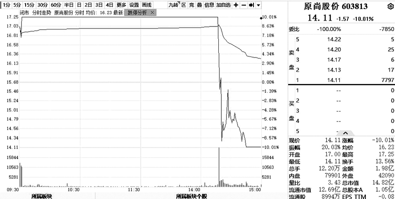 原尚股份(603813)15日上演了“天地板”行情。周一早盤,公司股價開盤后快速漲停,實現了“5天4板”的較強走勢。不過午后,公司股價突然“高臺跳水”,半個小時內,股價從漲停板快速砸到跌停板,日內振幅高達20.03%。