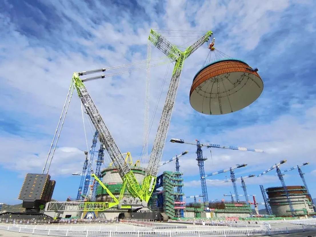 “華龍一號(hào)”福清核電5號(hào)機(jī)組穹頂成功吊裝的經(jīng)驗(yàn),為我國(guó)第三代核電核島穹頂?shù)跹b打下了“樣板”。福清核電、漳州核電、昌江核電,從“華龍一號(hào)”到“玲龍一號(hào)”,ZCC3200NP履帶式起重機(jī)跟隨國(guó)家大型核電工程“四處征戰(zhàn)”,始終奮戰(zhàn)在核電建設(shè)的第一線,多次創(chuàng)造施工吊重、速度和質(zhì)量紀(jì)錄,為我國(guó)核電的自主安全建設(shè)提供了堅(jiān)實(shí)的設(shè)備保障,中聯(lián)重科起重機(jī)也成為了中國(guó)核電建設(shè)的“最佳搭檔”。