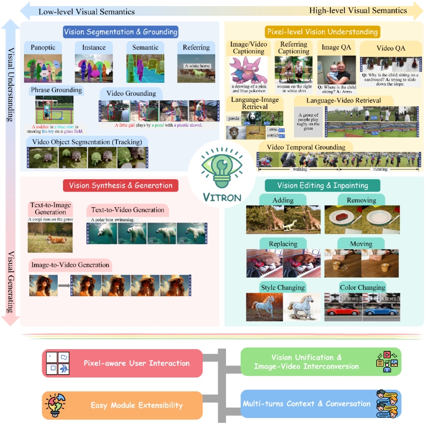 為了填補這個空白,近日,昆侖萬維2050全球研究院、新加坡國立大學(xué)、新加坡南洋理工大學(xué)團隊聯(lián)合發(fā)布開源了Vitron通用像素級視覺多模態(tài)大語言模型。Vitron支持從視覺理解到視覺生成、從低層次到高層次的一系列視覺任務(wù),包括靜態(tài)圖像和動態(tài)視頻內(nèi)容進行全面的理解、生成、分割和編輯等任務(wù)。