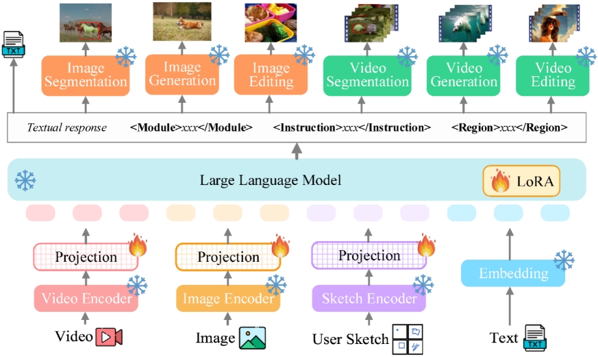 這是一款重磅的通用視覺多模態(tài)大模型,支持從視覺理解到視覺生成、從低層次到高層次的一系列視覺任務(wù),解決了困擾大語言模型產(chǎn)業(yè)已久的圖像/視頻模型割裂問題,提供了一個全面統(tǒng)一靜態(tài)圖像與動態(tài)視頻內(nèi)容的理解、生成、分割、編輯等任務(wù)的像素級通用視覺多模態(tài)大模型,為下一代通用視覺大模型的終極形態(tài)奠定了基礎(chǔ),也標(biāo)志著大模型邁向通用人工智能(AGI)的又一大步。