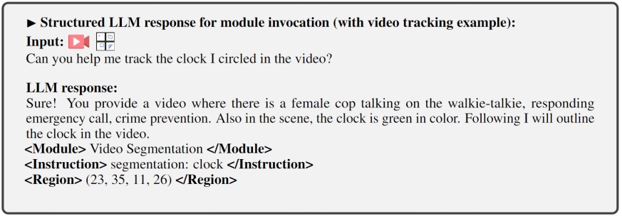 4) 區(qū)域(可選輸出),指定某些任務(wù)所需的細(xì)粒度視覺特征,例如在視頻跟蹤或視覺編輯中,后端模塊需要這些信息。對于區(qū)域,基于LLM的像素級理解,將輸出由坐標(biāo)描述的邊界框。