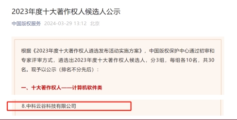 △中科云谷入選計算機軟件類十大著作權人榜單
