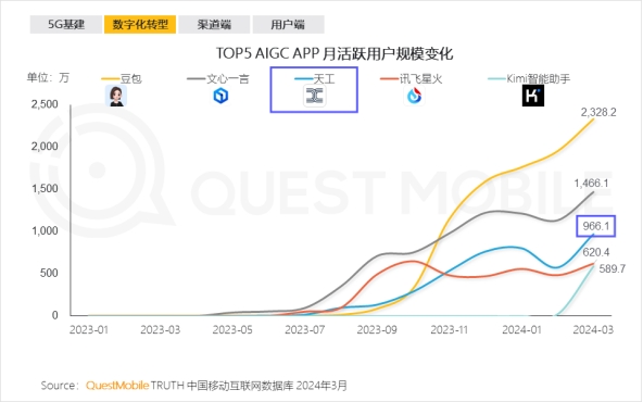 根據國內商業智能數據服務商QuestMobile數據,早在2024年3月,昆侖萬維天工AI APP的月活躍用戶已達近千萬,僅次于豆包與文心一言,成為國內AIGC APP月活躍用戶第三。