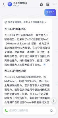 例如,在AI搜索增強模式中,天工AI能夠針對用戶的復雜Query進行拆解、細化、并進行追問、信息理解與補全,使其在自然語義理解方面性能更強,面對不確定性知識時表現更好,能夠更精準、高效地滿足用戶需求。