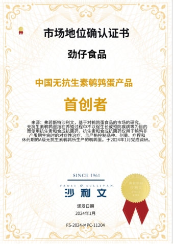 今年,勁仔食品推出行業首創的溏心鵪鶉蛋,并通過強化上游養殖基地管理,使得該產品從養殖到生產各環節均獲得無抗認證,踐行“做好吃又健康的休閑食品,改善人們生命質量”的企業使命。勁仔鵪鶉蛋的創新被沙利文確認為“中國無抗生素鵪鶉蛋產品首創者”。