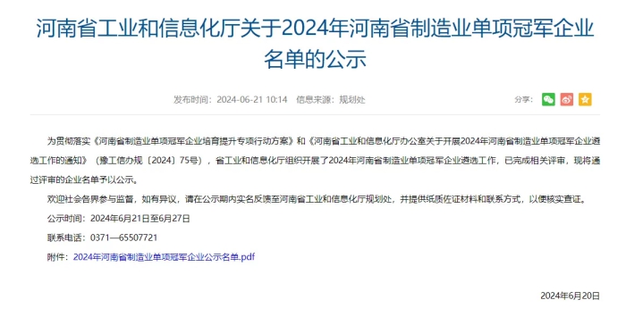 近日,河南省工業和信息化廳公示2024年河南省制造業單項冠軍企業名單,河南通達電纜股份有限公司成功獲評。