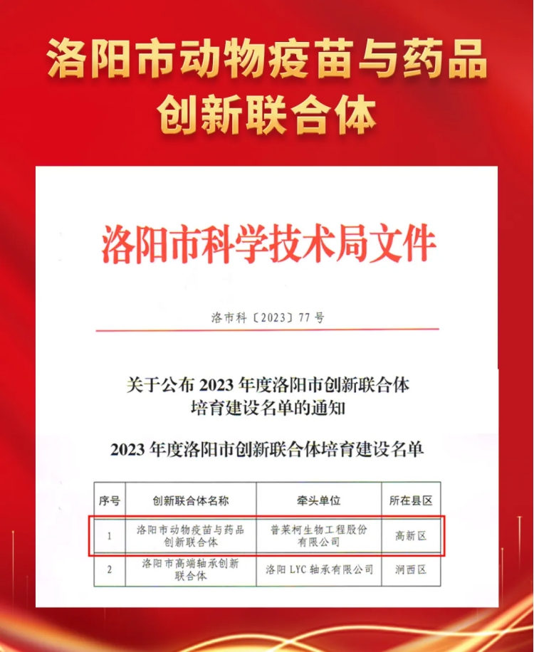 近日,洛陽市科技局發(fā)布2023年度創(chuàng)新聯(lián)合體獲批名單,普萊柯獲批牽頭組建“洛陽市動(dòng)物疫苗與藥品創(chuàng)新聯(lián)合體”。