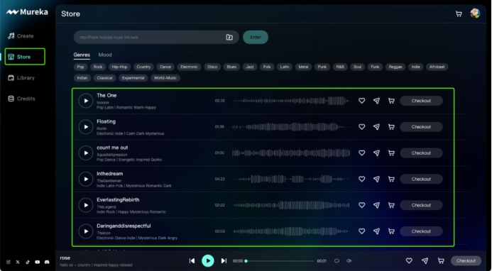 在Mureka創(chuàng)作歌曲將消耗用戶付費積分(credits)。歌曲創(chuàng)作完成后,用戶可以下載創(chuàng)作證明,并申請在Mureka歌曲商店(Store)中進行展示出售。也可以付費購買歌曲的伴奏和分軌音頻。用戶在平臺出售歌曲的收益,Mureka會按既定比例進行抽傭。