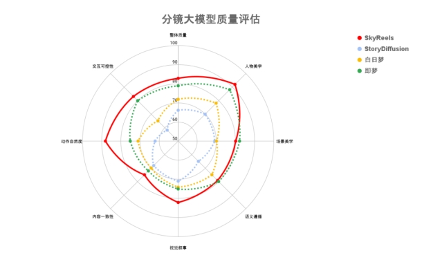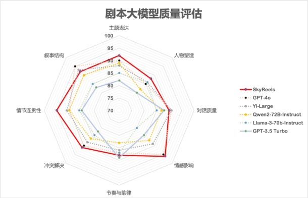 SkyReels在劇本質(zhì)量、分鏡質(zhì)量、人物表演質(zhì)量等各維度質(zhì)量評估上均領(lǐng)先于GPT-4o等大模型