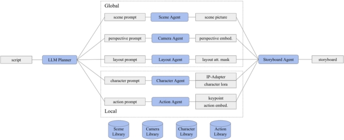 輸入劇本后,StoryboardGen模型會將劇本拆解成全局與主體兩部分,全局部分包括場景、景別、構(gòu)圖等對分鏡的整體描述,主體部分包括角色形象、動作人物角色的定制,最終匯集至故事板(Storyboard)智能體生成完整分鏡。StoryboardGen的專項(xiàng)多智能體架構(gòu),能夠有效保證人物與場景的可控性和一致性,創(chuàng)造出高質(zhì)量的工業(yè)級分鏡。