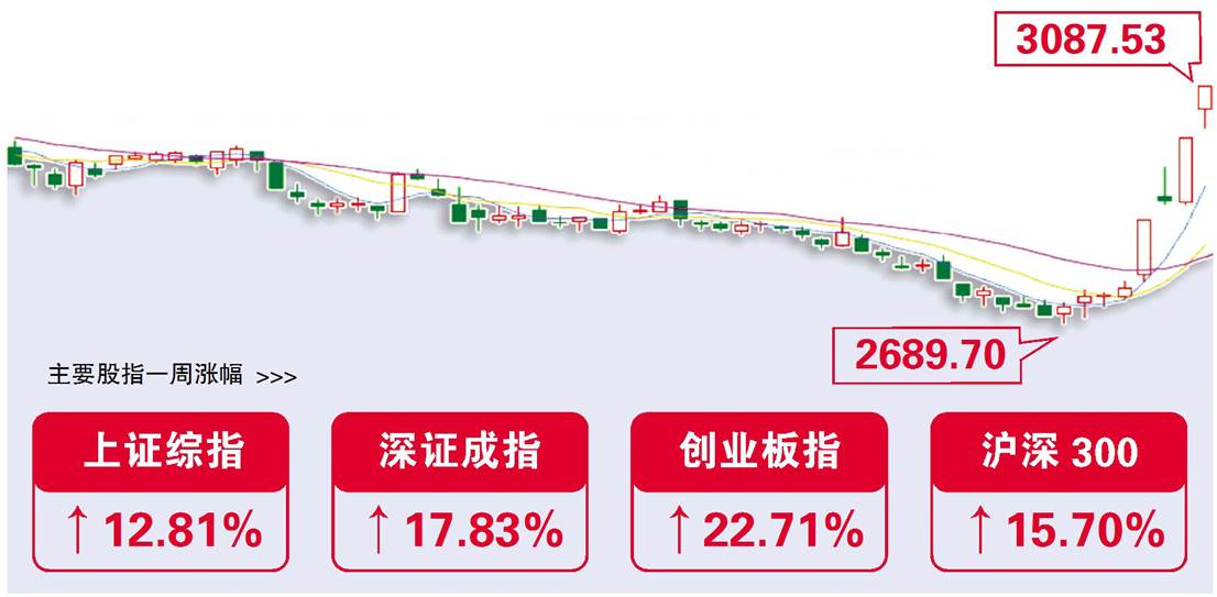 本周,受一攬子政策利好消息的刺激,大盤放量大漲。上證綜指一周上漲12.81%,報收3087.53點;深證成指上漲17.83%,報收9514.86點;創業板指上漲22.71%,報收1885.49點;滬深300指數上漲15.70%,報收3703.68點。