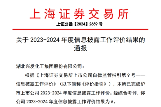 近期,滬深交易所分別發布2023-2024年度信息披露考評結果,興發集團再次榮獲最高評級——A級,這是公司近五年第4次獲此殊榮,也是上市以來第7次獲得最高評價。
