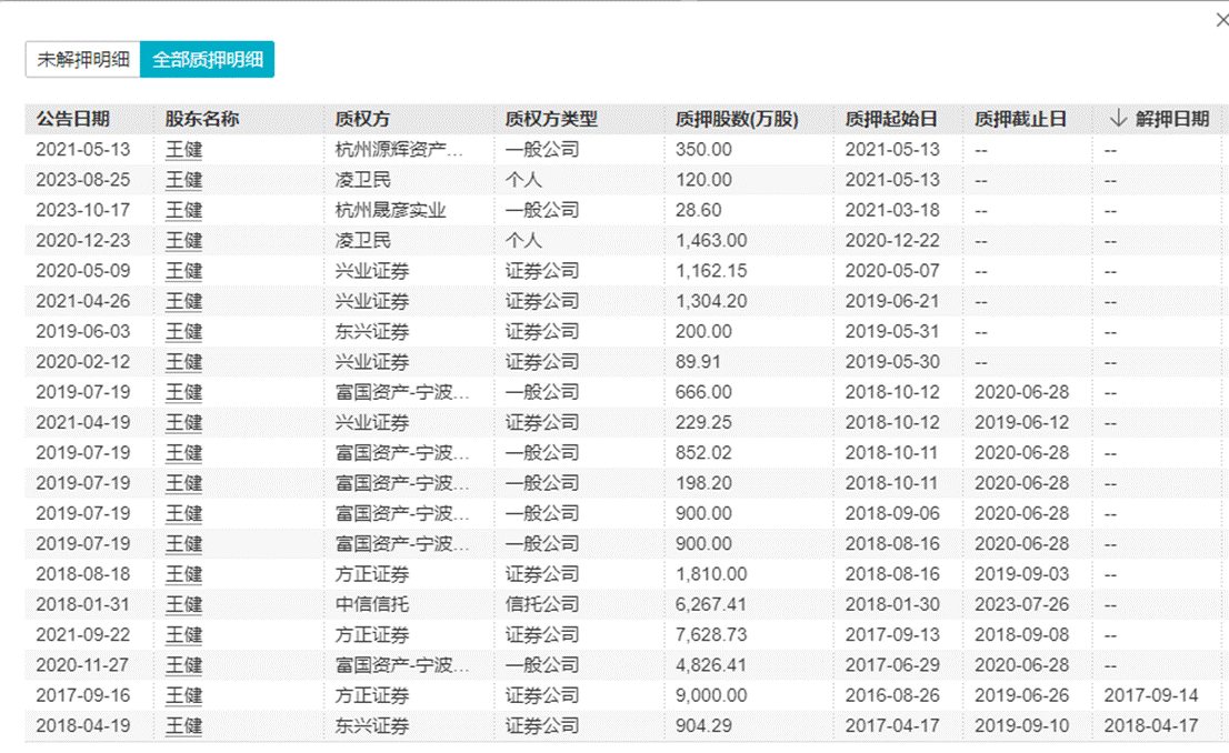 (王健的股權質(zhì)押明細 數(shù)據(jù)來源:Wind)