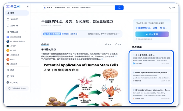 2023年8月23日,天工推出了國內首個AI搜索產品——天工AI搜索。一年多以來,天工AI搜索保持了持續迭代創新。2024年第三季度,天工在網頁端率先推出了高級搜索模式,該模式能夠深度理解用戶需求,尤其在面對復雜問題時,系統會自動規劃解決路徑,依次執行,并給出全面準確的解答。此外,高級搜索模式收錄了國內外權威領域的網頁和PDF文檔,涵蓋學術論文、研究報告、財報、研報、公告和資訊等,較之前的AI搜索能夠確保信息的全面性和時效性。