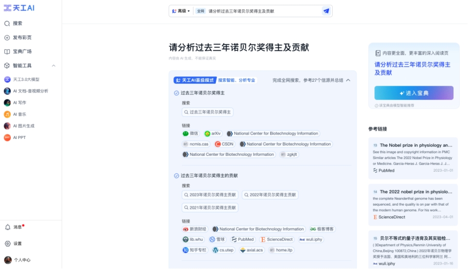 我們可以看到,AI先自己查詢了過去三年諾貝爾獎得主,然后再查詢每位獲獎者的詳細貢獻,并且給出了足夠豐富、權威、可追溯的信源,在右側參考鏈接欄,可以直接點擊追溯原論文或信息源。