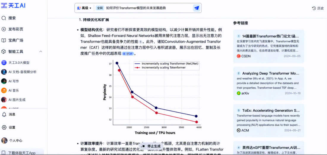 讓天工AI“評價Transformer模型的未來發展趨勢”,它不僅分析了幾十篇中英文論文,還將圖片和技術術語進行詳解,從技術細節、最新進展、應用現狀分析了專業AI領域的問題。