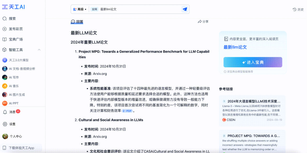 天工AI要做最懂科研的搜索助手,用戶只需輸入查詢意圖,就能“端到端”快速定位到相關高質量論文。不僅能夠直接呈現精確匹配的文獻,還能自動生成關鍵信息的總結與引用,支持用戶快速獲取論文核心內容。