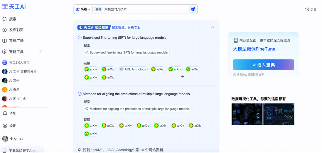 但是在天工AI中,我們盡管只輸入一句搜索關鍵詞“詳細解讀天工大模型”,天工AI則會自動擴展它的定義、背景、技術架構、案例等,一次性為用戶展示出來,并在每個問題拆解中都涵蓋arXiv等權威信源。