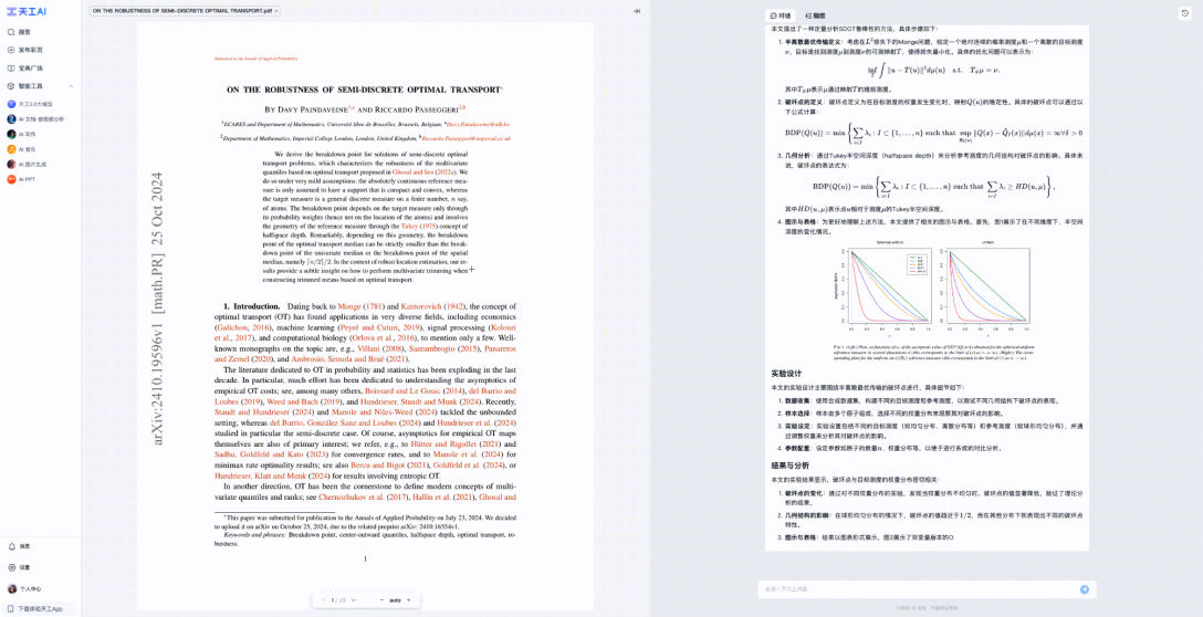 其次,“天工AI閱讀”新增了針對學術論文、公司財報、券商研報等場景的深度解析模式,點擊文檔深度解析后可直達文檔AI解讀和AI對話功能,可以對完整的文檔進行精讀,并且產生圖文并茂的AI解讀。