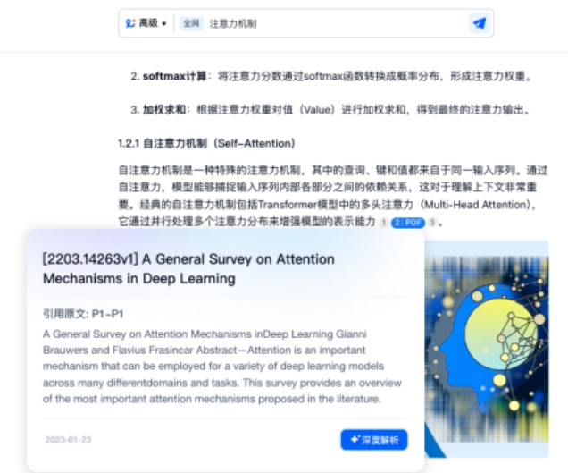 首先,在高級模式下,增加了新的交互和功能:PDF引用信源、PDF浮窗、引用原文展示、深度解析、專業信源展示。