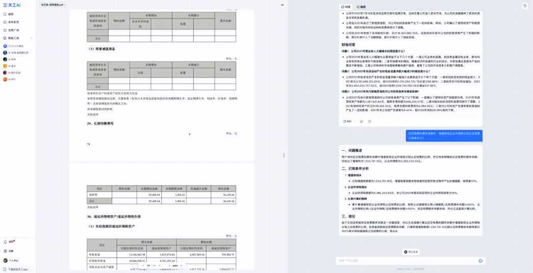 例如,用戶上傳一份132頁的超長財務報告,要求“天工AI閱讀”分析:“應交稅費的期末余額中,增值稅和企業所得稅分別占總稅費比例是多少?” 天工AI能夠快速找到對應原文位置后,提取第80頁表格內的數據,經過推理和計算后最終回答給出指標。