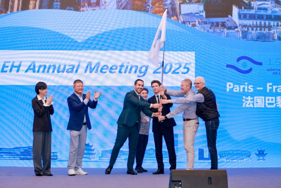 愛爾眼科醫院集團全球總裁李力,第18屆WAEH年會聯席主席、愛爾眼科醫院集團副總裁張詠梅將WAEH旗幟轉交給下屆WAEH年會主辦國-瑞士和法國的代表