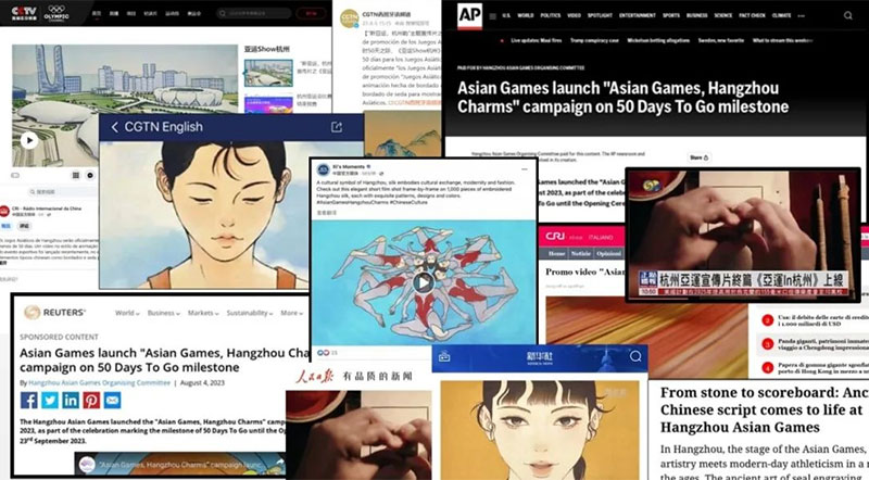 在2023年杭州第19屆亞運(yùn)會(huì)開幕式前夕,三支宣傳片陸續(xù)上線,迅速引爆網(wǎng)絡(luò)——國內(nèi)外媒體的積極報(bào)道,包括人民日?qǐng)?bào)、新華社、中央廣播電視總臺(tái)等中央主要新聞媒體,以及美聯(lián)社、英國路透社、美國《時(shí)代》周刊、香港鳳凰衛(wèi)視、臺(tái)灣《聯(lián)合報(bào)》等知名媒體,傳播區(qū)域覆蓋數(shù)十個(gè)重點(diǎn)國家和地區(qū);還獲得了中國官方媒體賬號(hào)Xi's Moments以及駐美國大使館發(fā)言人、駐洛杉磯總領(lǐng)事、駐巴基斯坦大使館文化參贊、蒙古國奧委會(huì)主席的點(diǎn)贊轉(zhuǎn)發(fā)。