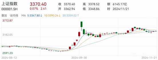 周四,A股三大股指集體小幅低開。早盤兩市弱勢震蕩小幅低收,兩市成交額不足萬億元。午后沖高后快速回落,尾盤回暖,三大股指幾乎平收,滬指微漲三連陽。截至收盤,上證綜指上漲0.07%,報3370.4點;科創50指數上漲0.89%,報1011.46點;深證成指下跌0.07%,報10819.88點;創業板指下跌0.09%,報2265.87點。滬深兩市成交總額16113億元,較前一交易日的16143億元減少30億元。