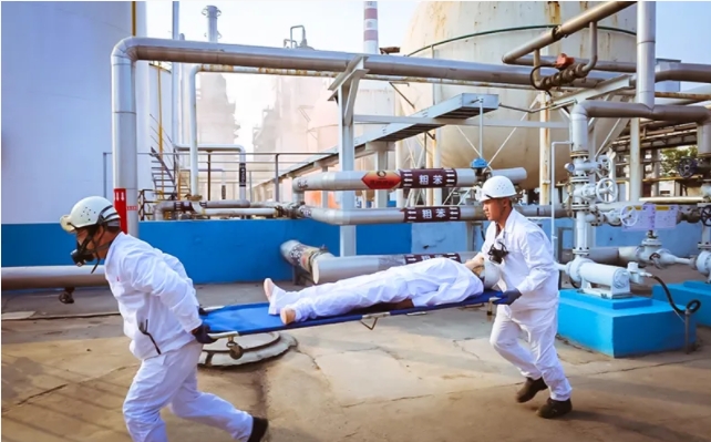 本次實戰(zhàn)演練,模擬的是鐵雄冶金2#粗苯儲槽入口管線軟連接處發(fā)生?;沸孤?、進而引發(fā)著火及人員中毒。鐵雄冶金事先制定了完備的演練方案,整個過程完全按照應(yīng)急救援方案規(guī)范有序進行,在最短時間內(nèi)搶救人員和撲滅明火。