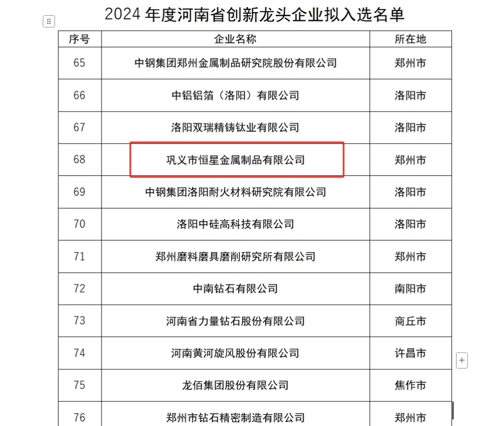 12月30日,河南省科學技術廳發布關于河南省創新龍頭企業遴選結果的公示。其中,鞏義市恒星金屬制品有限公司(以下簡稱“恒星金屬”或“公司”)入選河南省創新龍頭企業擬定名單。