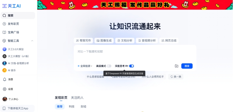 「天工AI」接入DeepSeek R1模型,“聯網搜索”無限次暢爽使用