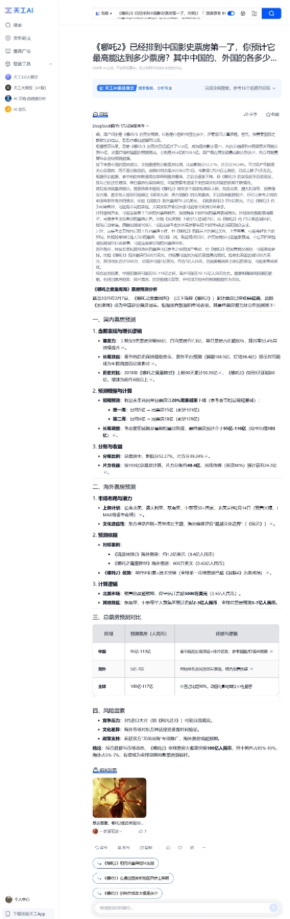在搜索領域,「天工AI」的“深度思考 R1”模式,可以輕松絲滑地集成“聯網搜索”功能。我們以2月6日票房剛剛登頂中國影史第一的《哪吒2》為例,讓它預測一下《哪吒2》的最終票房。