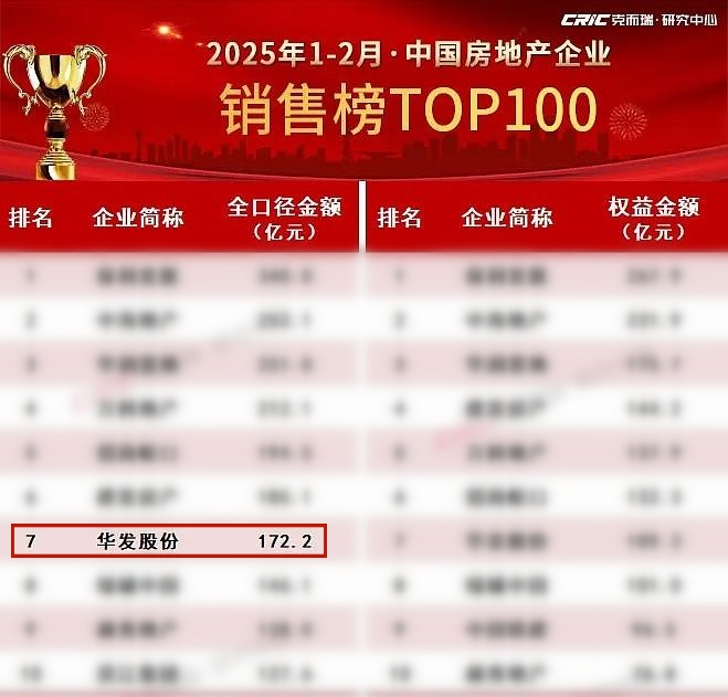得益于銷售持續取得突破,華發股份以1054.4億元的銷售金額躋身2024年克而瑞房地產銷售排行榜TOP10,同比提升4位,連續5年穩居千億陣營,躋身行業第一梯隊。2025年1-2月,華發股份更是喜迎開門紅,以全口徑銷售額172.2億元,躋身克而瑞全國房企銷售榜TOP7。