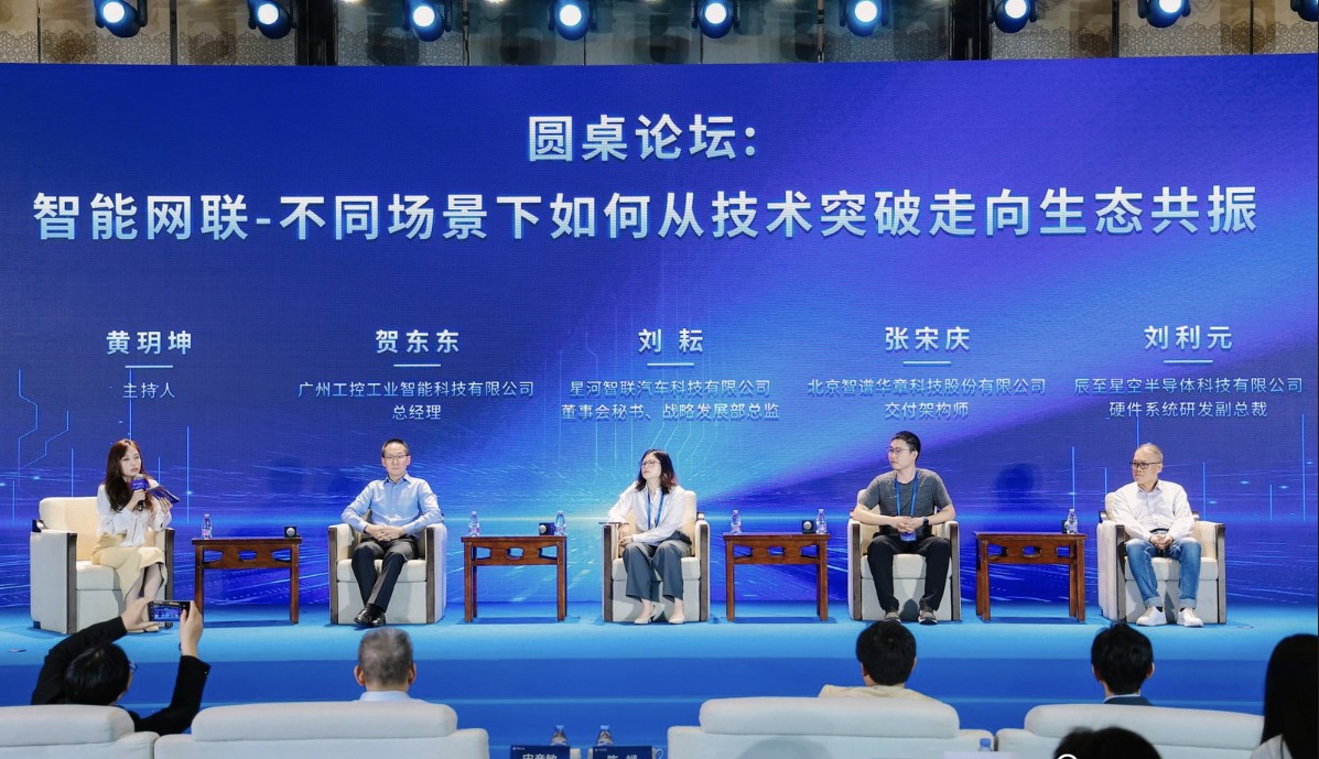 大會中,圓桌論壇環節主題為“智能網聯-不同場景下如何從技術突破走向生態共振”,廣州工控總經理賀東東、星河智聯董事會秘書、戰略發展部總監劉耘、北京智譜華章交付架構師張宋慶、辰至半導體硬件系統研發副總裁劉利元,圍繞如何通過技術突破和生態共建來破解行業孤島,釋放智能網聯的更大價值進行了探討交流。