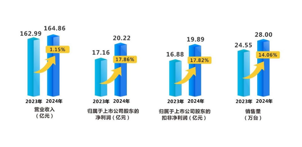 4月17日,杭叉集團(股票代碼:603298)發布2024年度財報,交出一份營收穩健增長、凈利潤大幅提升的亮眼成績單。在全球經濟波動與行業競爭加劇的背景下,公司以新能源創新與全球化布局為核心戰略,實現營業收入164.86億元(同比增長1.15%),歸母凈利潤20.22億元(同比增長17.86%),凈利增幅顯著高于營收,展現出強勁的盈利能力和高質量發展韌性。