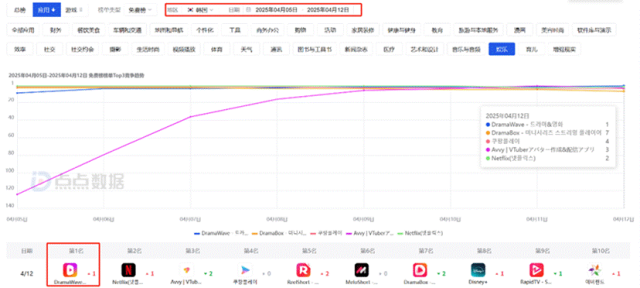 截至2025年3月,DramaWave月活躍用戶量已突破1000萬大關(guān),用戶規(guī)模成功躋身行業(yè)前五,穩(wěn)居出海短劇賽道第一梯隊(duì)。平臺旗下爆款短劇《訂婚風(fēng)暴》表現(xiàn)強(qiáng)勁,上線僅5天播放量便突破千萬大關(guān)。在該劇的推動下,DramaWave自4月5日起成功躋身韓國Google Play娛樂應(yīng)用榜TOP 10,并持續(xù)逼近長期占據(jù)領(lǐng)先地位的Netflix。隨后,其市場表現(xiàn)進(jìn)一步攀升,于4月12日登頂該榜單榜首,并連續(xù)霸榜四天,實(shí)現(xiàn)在韓國市場對Netflix的超越。