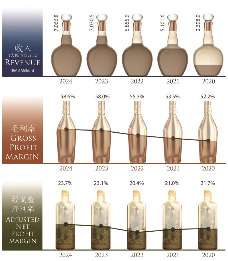 滄海橫流,方顯英雄本色。在白酒行業(yè)激烈的競爭格局中,珍酒李渡的競爭優(yōu)勢愈發(fā)凸顯,從行業(yè)對比看,2024年,珍酒李渡毛利率提升至58.6%(以A股會計(jì)準(zhǔn)則計(jì)算為75.5%),經(jīng)調(diào)整凈利率提升至23.7%,兩項(xiàng)關(guān)鍵指標(biāo)同比均提升0.6個百分點(diǎn)。