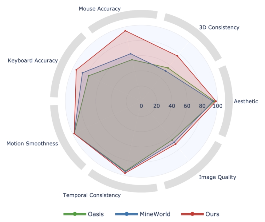 在GameWorld Score評測系統中,Matrix-Game在視覺質量、時間一致性、動作可控性與物理規則理解四大維度上均取得領先成績,全面超越現有開源基線模型 Oasis 與 MineWorld。