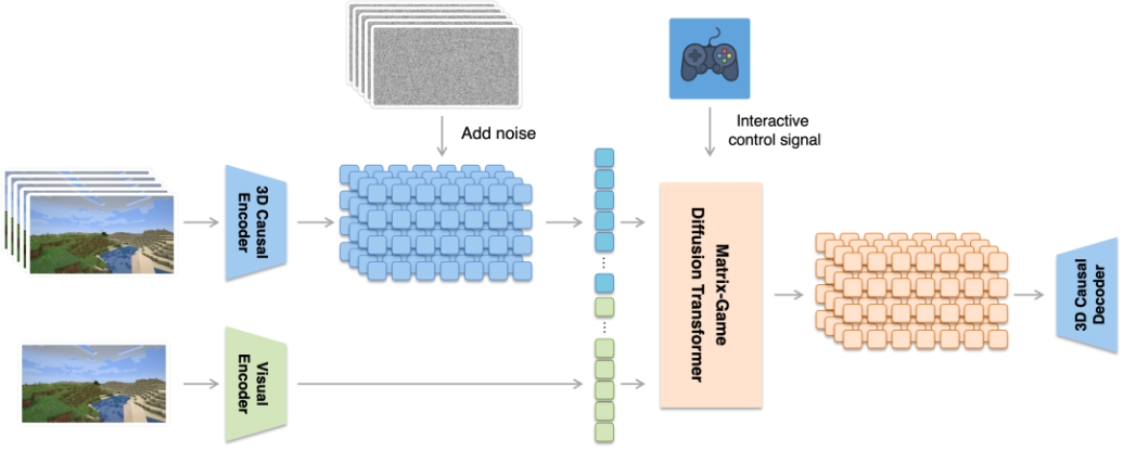 § 交互可控生成:融合用戶動作輸入(如鍵盤、鼠標等),通過類似Flux與HunyuanVideo的多模態擴散模型直接生成虛擬游戲世界的視頻內容。