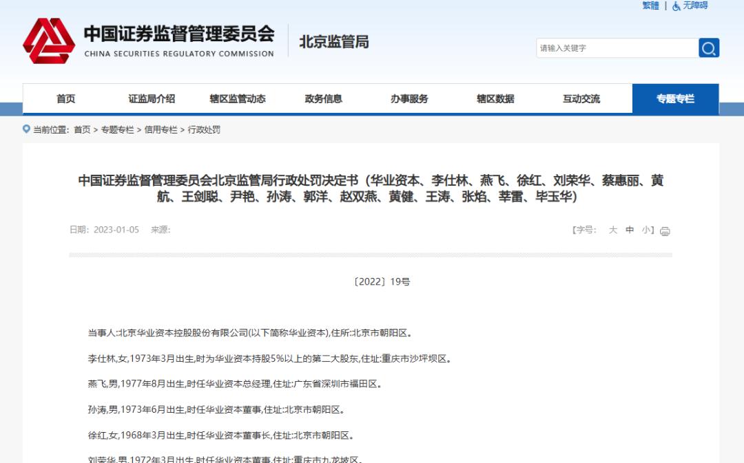 中國證監會網站顯示,2023年1月5日,北京證監局公開了對原A股上市公司華業資本的行政處罰決定書。因涉嫌各類信披違規,該局對李仕林、時任董事長徐紅、時任總經理燕飛、時任董事孫濤等16名高管給予警告,并分別處以3萬元至60萬元不等的罰款。