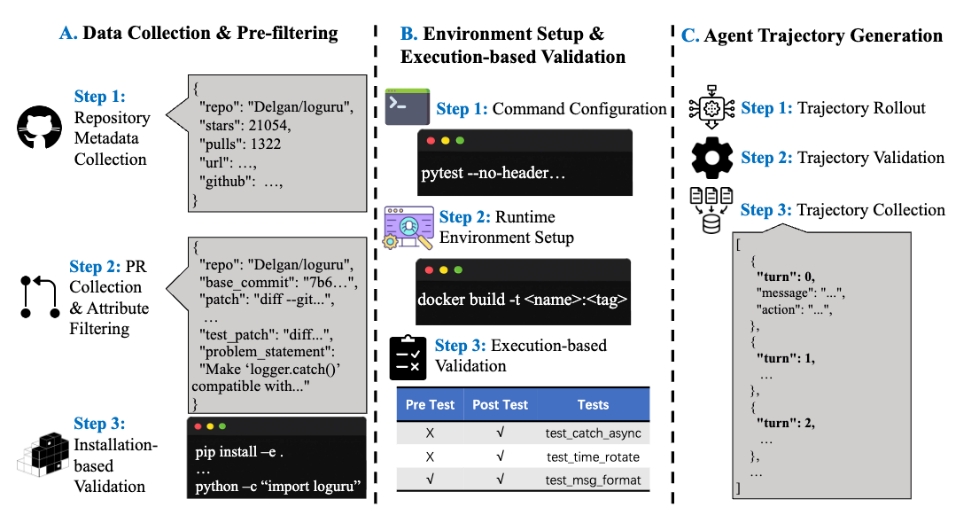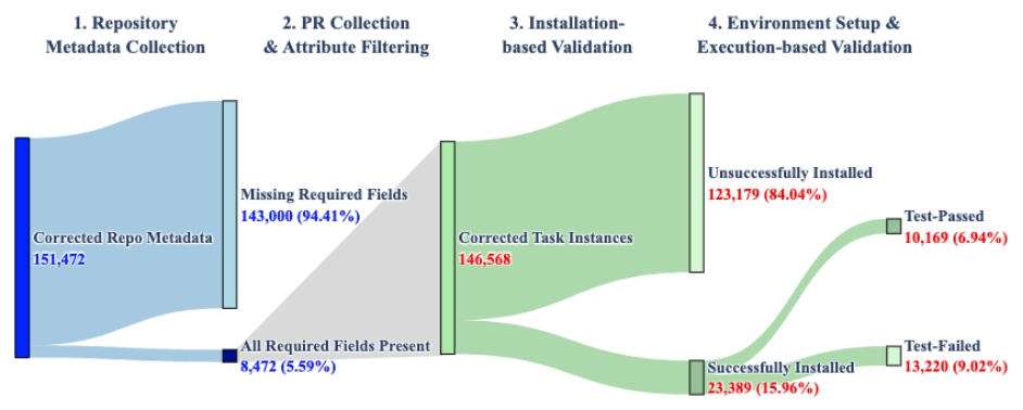 1. 缺乏可執行環境與驗證機制:已有開源數據(如SWE-bench-extra、SWE-Fixer)通常缺乏環境或單元測試來驗證數據正確性,導致生成的修復難以驗證。