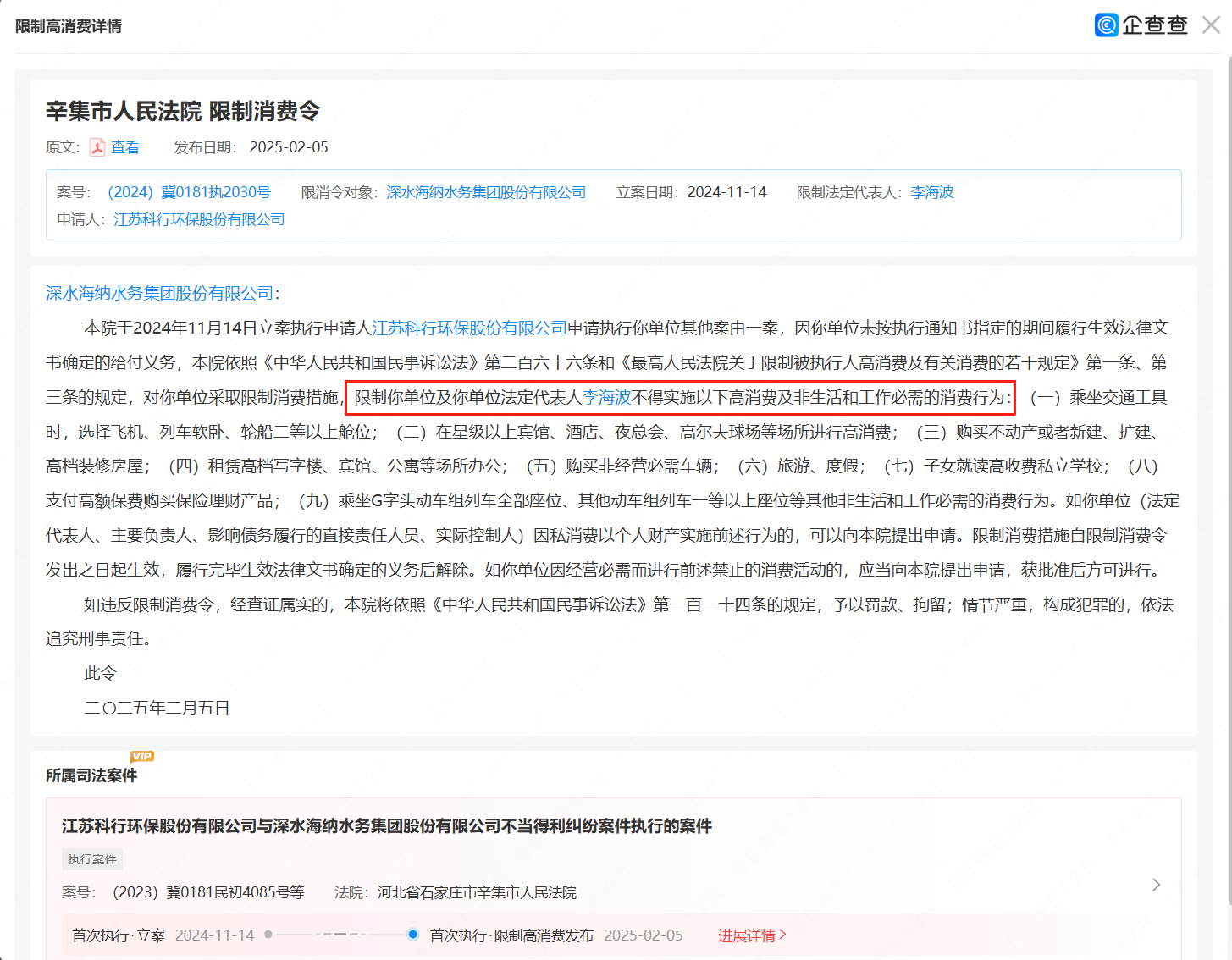 值得注意的是,今年2月,深水海納因未按期履行與江蘇科行環(huán)保股份有限公司相關(guān)案件生效法律文書確定的給付義務(wù),導(dǎo)致法定代表人李海波先生被限制高消費(fèi)。對于該情況,公司相關(guān)負(fù)責(zé)人向記者表示,目前限制高消費(fèi)的處罰仍未解除,對董事長李海波先生出差等相關(guān)活動仍有影響。