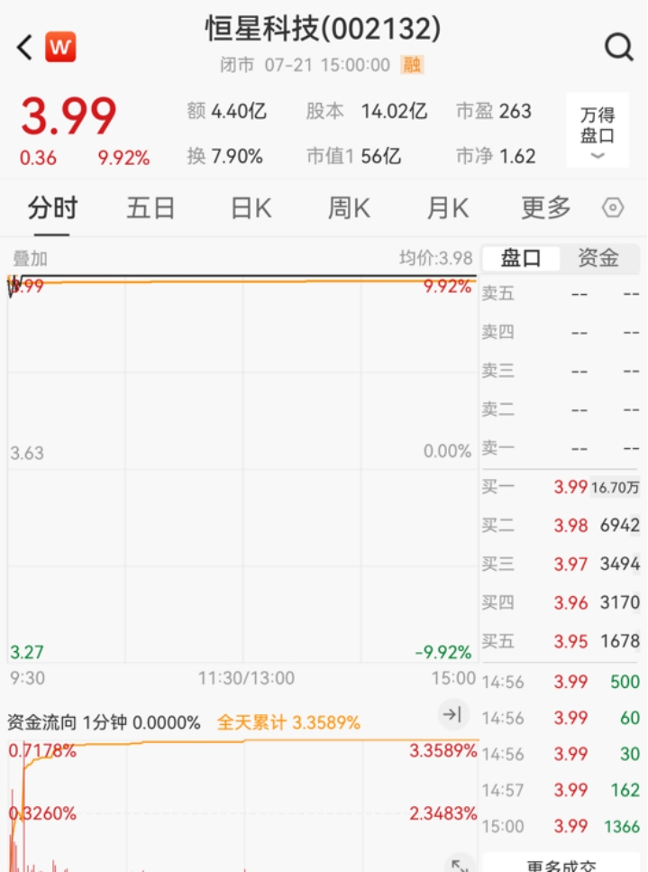 恒星科技(002132.SZ)早盤漲停,截至收盤報3.99元/股,全天成交金額為4.4億元,換手率為7.9%,近5個交易日累計上漲5.0%。