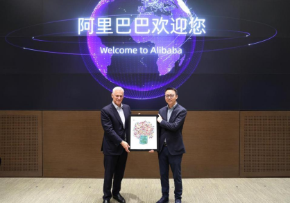 注:渣打集團行政總裁溫拓思與阿里巴巴集團CEO吳泳銘于阿里巴巴西溪園區會面并交換禮物