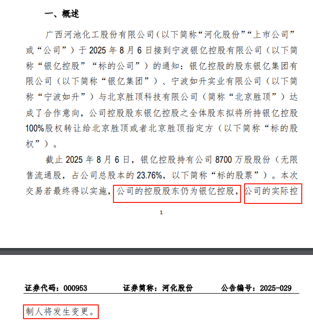 近日,河化股份(000953)披露了一系列關于控股股東寧波銀億控股有限公司(以下簡稱“銀億控股”)擬變更控制權的公告。8月6日晚間,河化股份公告稱,公司控股股東銀億控股之全體股東擬將所持銀億控股100%股權轉讓給北京勝頂科技有限公司(以下簡稱“北京勝頂”)或者北京勝頂指定方。本次交易若最終得以實施,公司的控股股東仍為銀億控股,公司的實際控制人將發生變更。