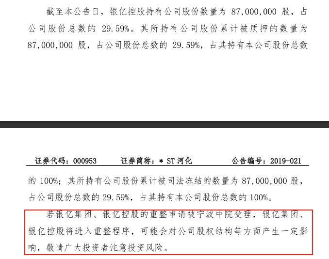 河化股份在2019年6月18日披露的提示性公告顯示,控股股東母公司銀億集團、控股股東銀億控股持續面臨流動性危機,若其進入重整程序,可能會對公司股權結構等方面產生一定影響。